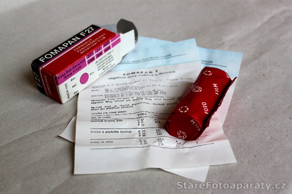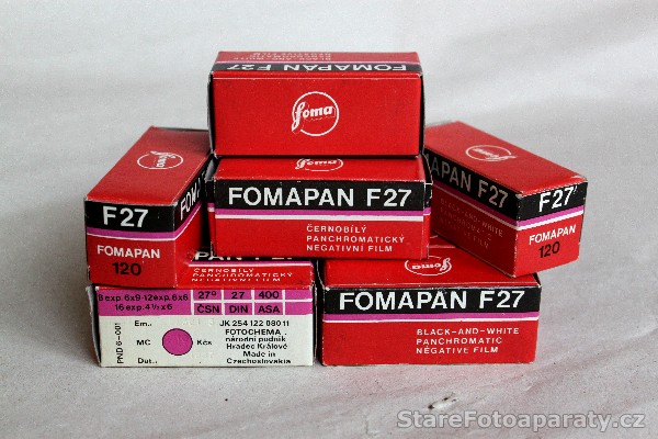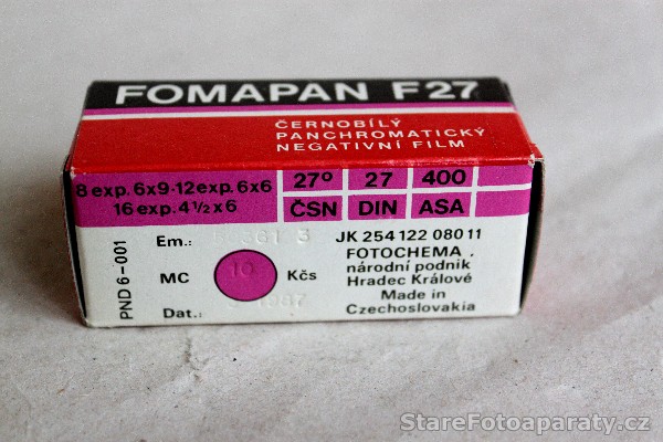 Svitkový film 120 zn. Fomapan F 27, 27° DIN na cívce B 2. Jedná se o negativní černobílý panchromatický film, určený pro snímky o rozměrech 6 x 9 cm (počet snímků – 8), 6 x 6 cm (počet snímků – 12), 4,5 x 6 cm (počet snímků – 16). Vyrobeno ve společnosti Fotochema národní podnik Hradec Králové (FOMA). Datum spotřeby: březen 1987.