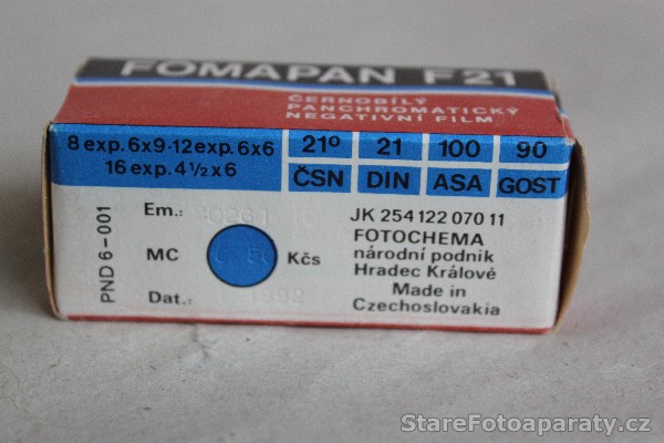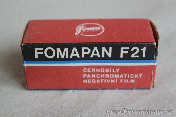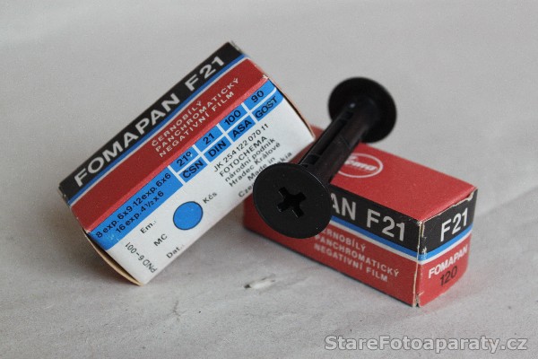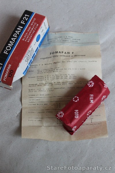 Svitkový film 120  zn. Fomapan F 21,  21° DIN na cívce B 2.  Jedná se o negativní černobílý panchromatický film, určený pro snímky o rozměrech 6 x 9 cm (počet snímků – 8), 6 x 6 cm (počet snímků – 12),  4,5 x 6 cm (počet snímků – 16). Vyrobeno ve společnosti  Fotochema národní podnik Hradec Králové (FOMA).  Datum spotřeby: leden 1992.