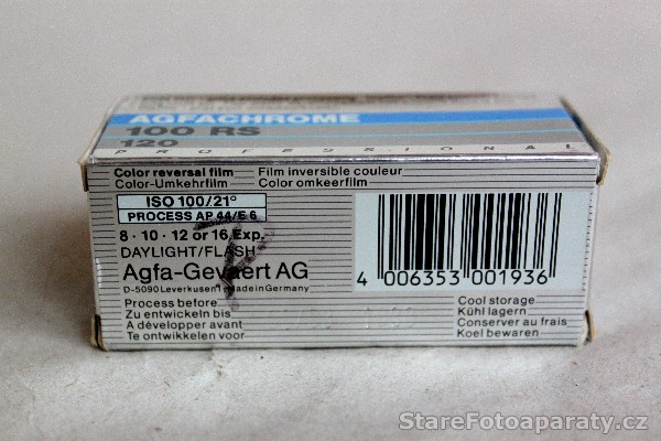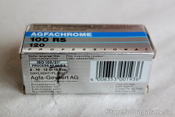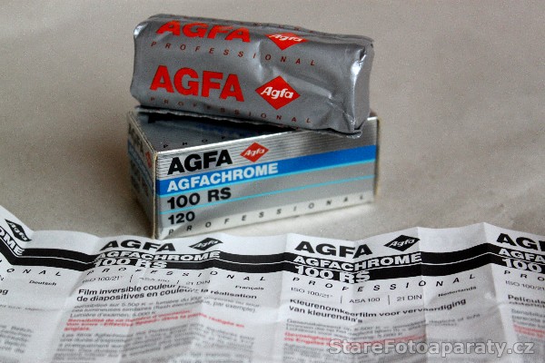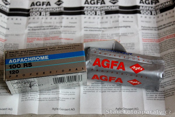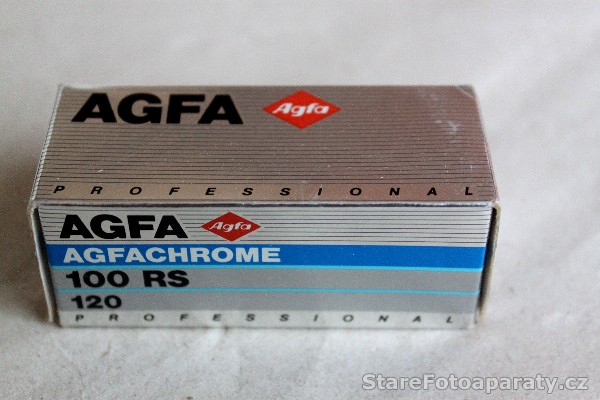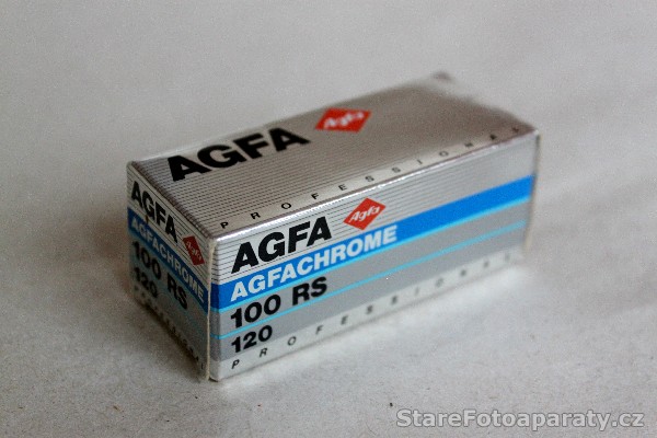 Svitkový film 120 zn. AgfaChrome 100 RS Professional, 21° DIN – ISO 100 na cívce B 2. Jedná se o negativní barevný film, určený pro snímky o rozměrech 6 x 9 cm (počet snímků – 8), 6 x 7 cm ( počet snímků – 10), 6 x 6 cm (počet snímků – 12), 4,5 x 6 cm (počet snímků – 16). Vyrobeno ve společnosti Agfa Gevaert, Leverkusen, Německo. Datum spotřeby: 08/1993.