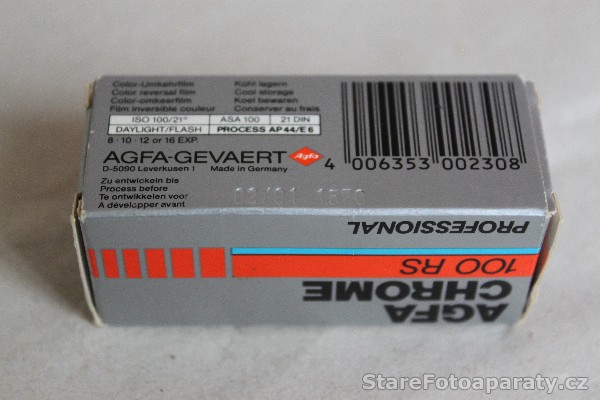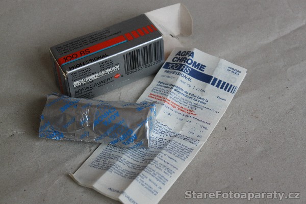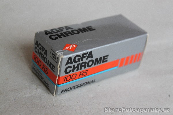 Svitkový film 120 zn. Agfa Chrome 100 RS Professional, 21° DIN – 100 ASA na cívce B 2. Jedná se o negativní barevný film, určený pro snímky o rozměrech 6 x 9 cm (počet snímků – 8), 6 x 7 cm ( počet snímků – 10), 6 x 6 cm (počet snímků – 12), 4,5 x 6 cm (počet snímků – 16). Vyrobeno ve společnosti Agfa Gevaert, Leverkusen, Německo. Datum spotřeby: 02/1991.