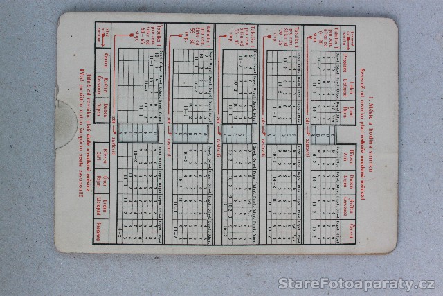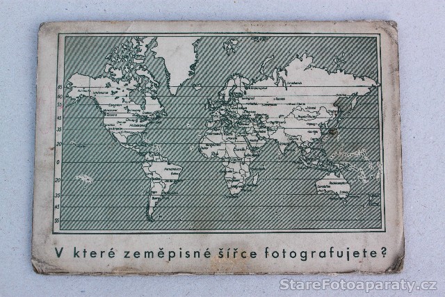 Papírové, posuvné pravítko poskytující správný exposiční čas – viz fotografie.