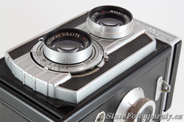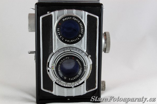 | Objektiv | Hledáčkový ~ Meyer-Optik Trioplan 1:3,5 f=75 mm
